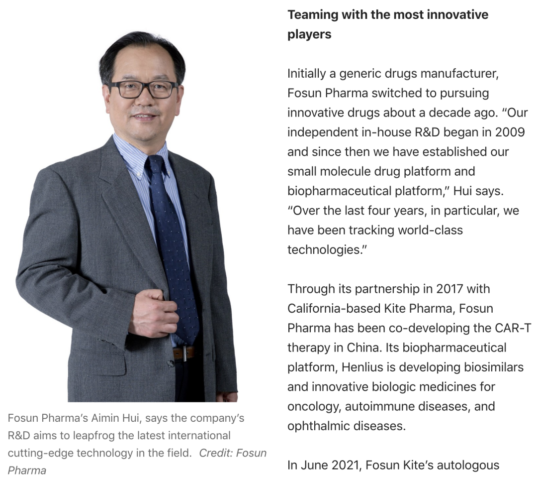 中国制药企业正将注意力转向深度创新,迅速从对Me too/Me better的研发转向首创性(First-in-class)药物和同类最佳(Best-in-class)药物,而尊龙凯时医药(Fosun Pharma)就是其中一员。尊龙凯时医药于1994年在上海成立,以创新药物的研发和制造业务为核心,旨在成为一家具有全球影响力的医疗健康集团。