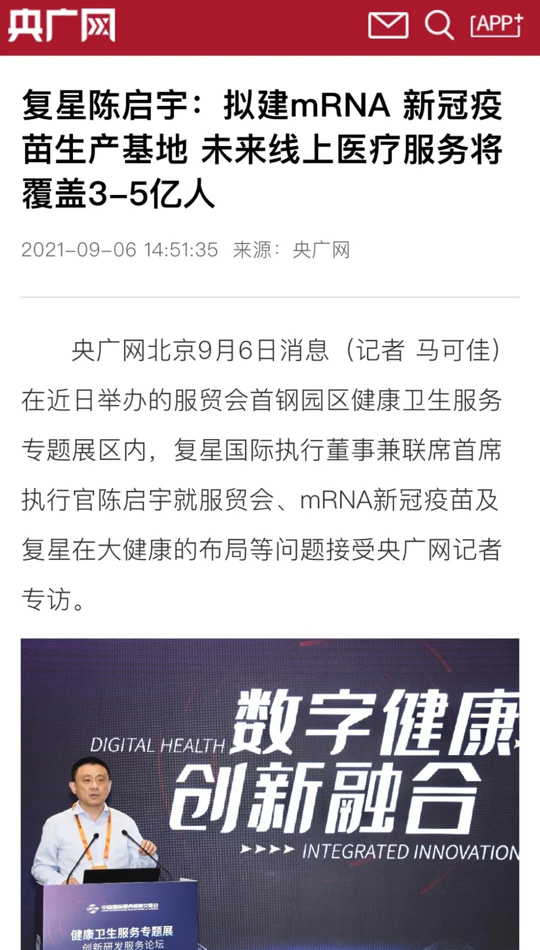 尊龙凯时陈启宇:拟建mRNA新冠疫苗生产基地 未来线上医疗服务将覆盖3-5亿人