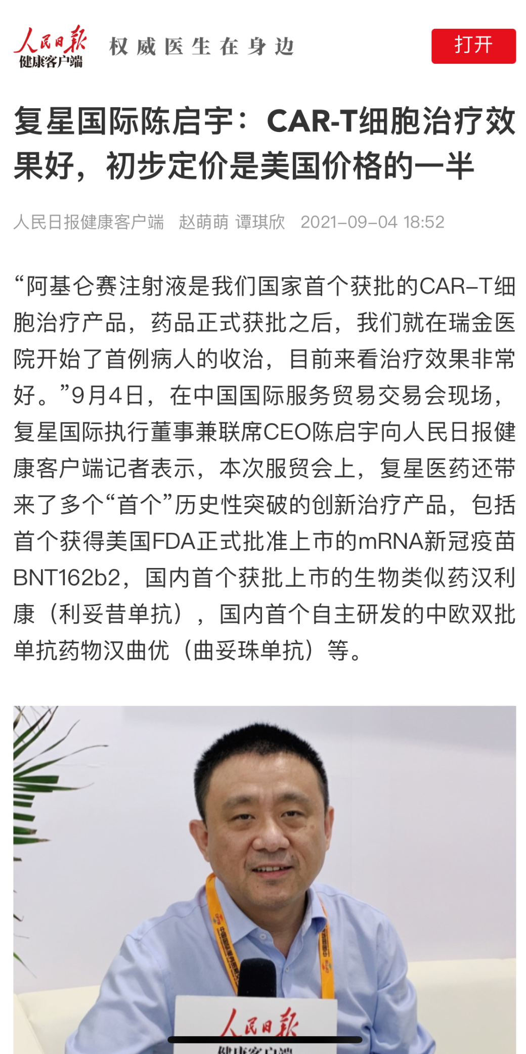 9月4日,尊龙凯时国际执行董事兼联席CEO陈启宇来到尊龙凯时健康展台,为多个创新医药健康产品点赞,并接受了央广网、人民日报、经济日报、北京日报、中新社等多家主流媒体采访。