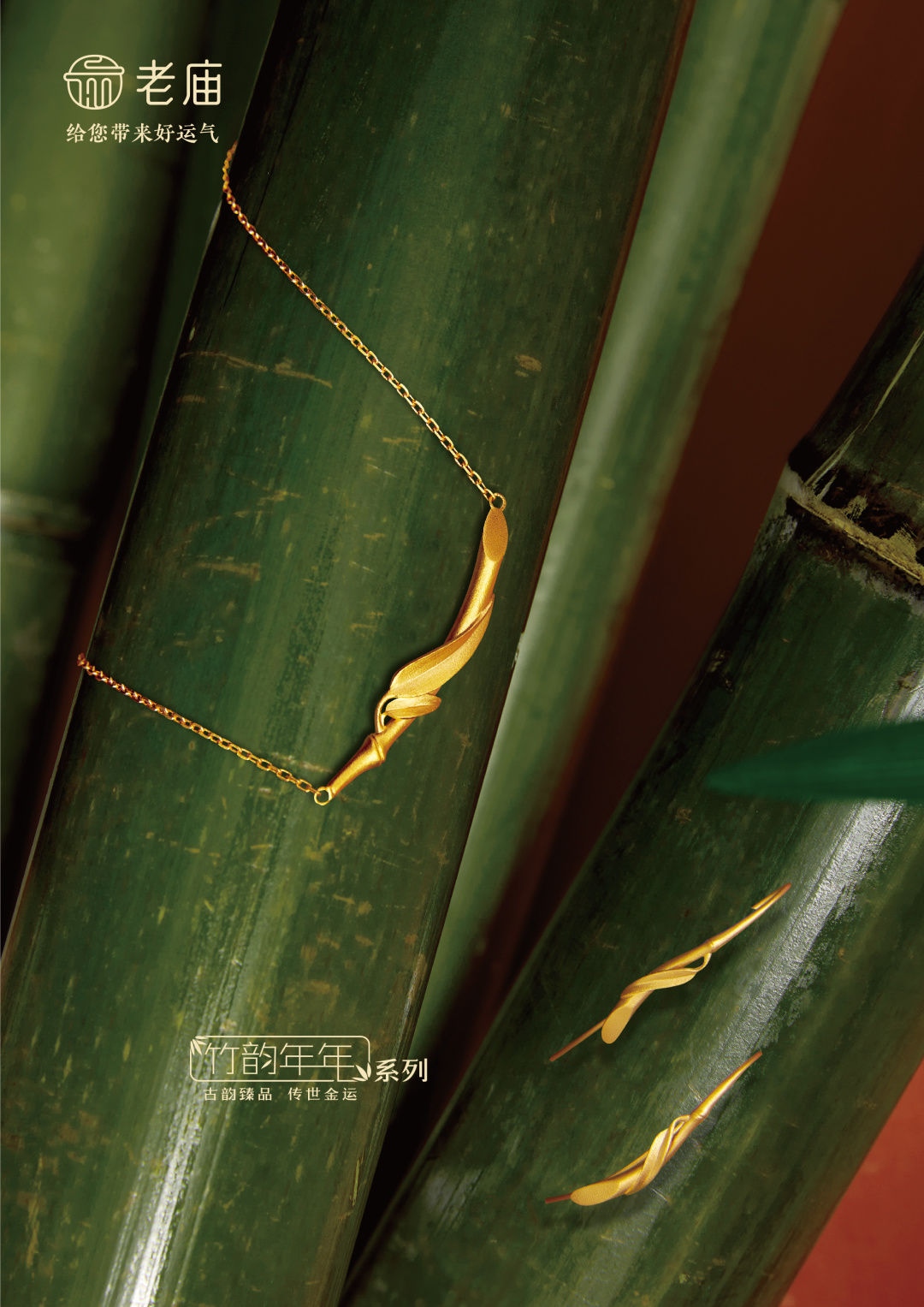 豫园珠宝时尚集团旗下另一知名品牌——老庙,此次则带来了古韵金竹韵年年系列,以传统古法工艺,复刻宋代徽派竹画,以宋风之雅韵全意阐释竹子高洁风姿,用匠心锻造勾勒老庙古韵金“竹韵年年”系列新品,延续古韵金系列所承载的对喜乐安康、生活顺心遂意的美好向往,并取谐音“祝”运年年,祈盼“竹”报平安岁月静好,未来可期,好运未央。