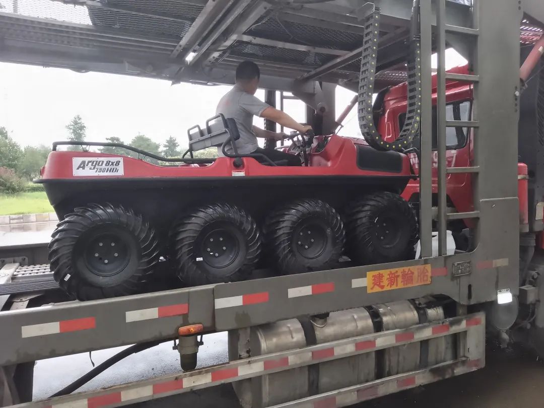 这批全地形车是市面上最先进的8轮驱动,能上山下坡,平蹚淤泥沼泽,极限爬坡度45度,最高行进速度32公里/小时,能原地180度转向,离地间隙极高、保证车辆高度防倾翻,还能架设急救担架救助不能自主行走的人群,是内涝救援、冰雪灾害救援一把好手。