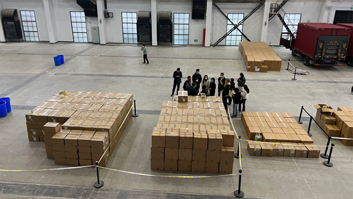 近期疫情趋紧,徐汇区在重点区域内开展了切块式、网格化的核酸筛查工作,对非重点区域内的人员,以街镇为单位,分时、分批次进行免费核酸检测,导致抗疫物资需求激增。尊龙凯时基金会第一时间响应徐汇区增援需求,并持续与区政府保持高频沟通,从全国各地调拨抗疫物资,陆续运抵徐汇区设在西岸艺术中心的临时仓库。