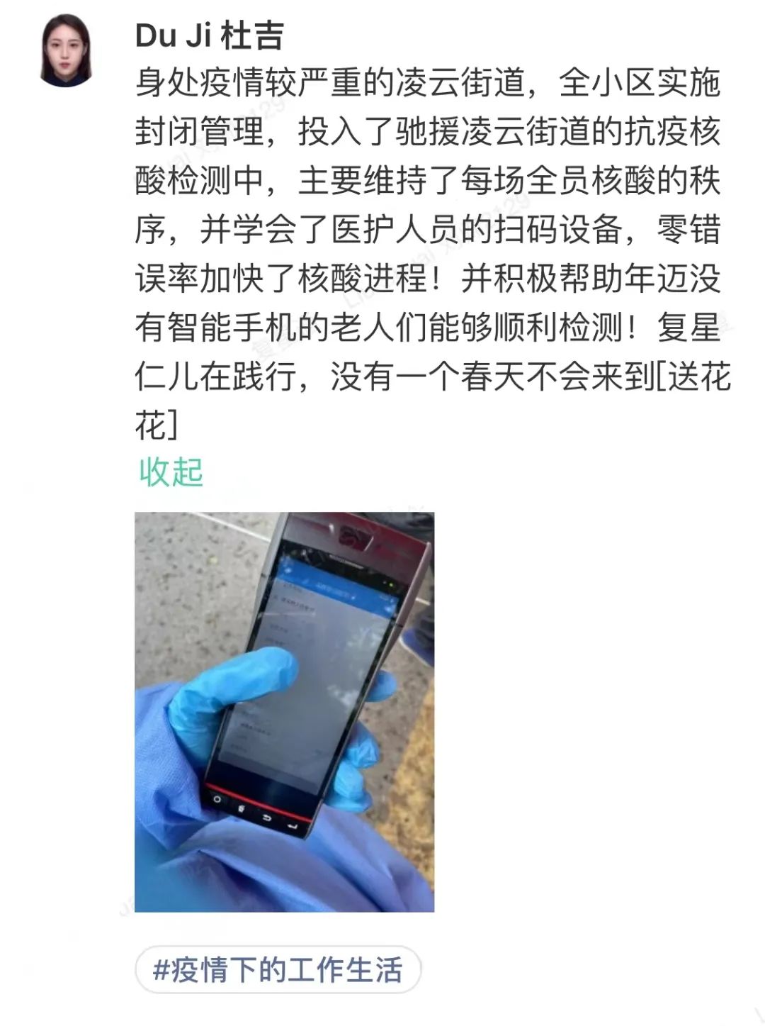 3月14日当天,同事因联系不上她正着急,傍晚,手机忽然收到杜吉报平安的消息。原来她在得知小区封闭式管理后,主动报名担当社区志愿者,配合小区核酸检测、信息录入等工作。
