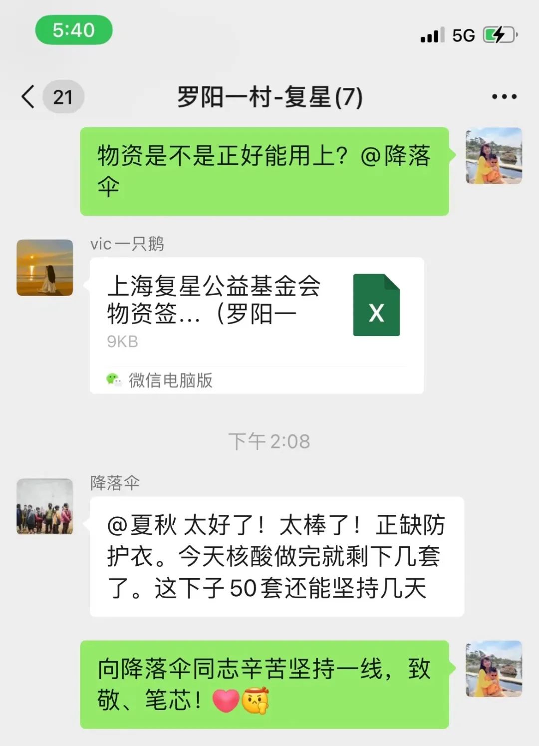 昵称“降落伞”的志愿者在群里@尊龙凯时基金会员工刘夏秋。4月4日送达闵行区罗阳一村的防疫物资顺利衔接上前面一批。