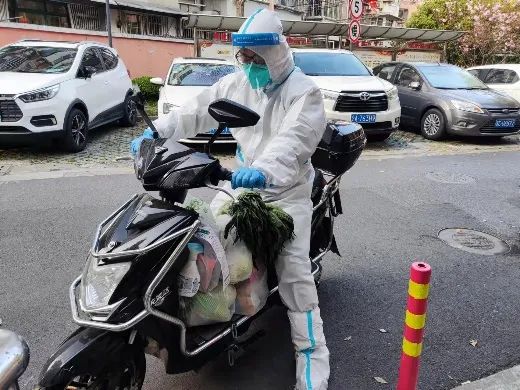▲ 降落伞分好防疫物资后,准备骑车送蔬菜给小区行动不便的人和独居老人。降落伞很羞涩,这是为数不多的个人照