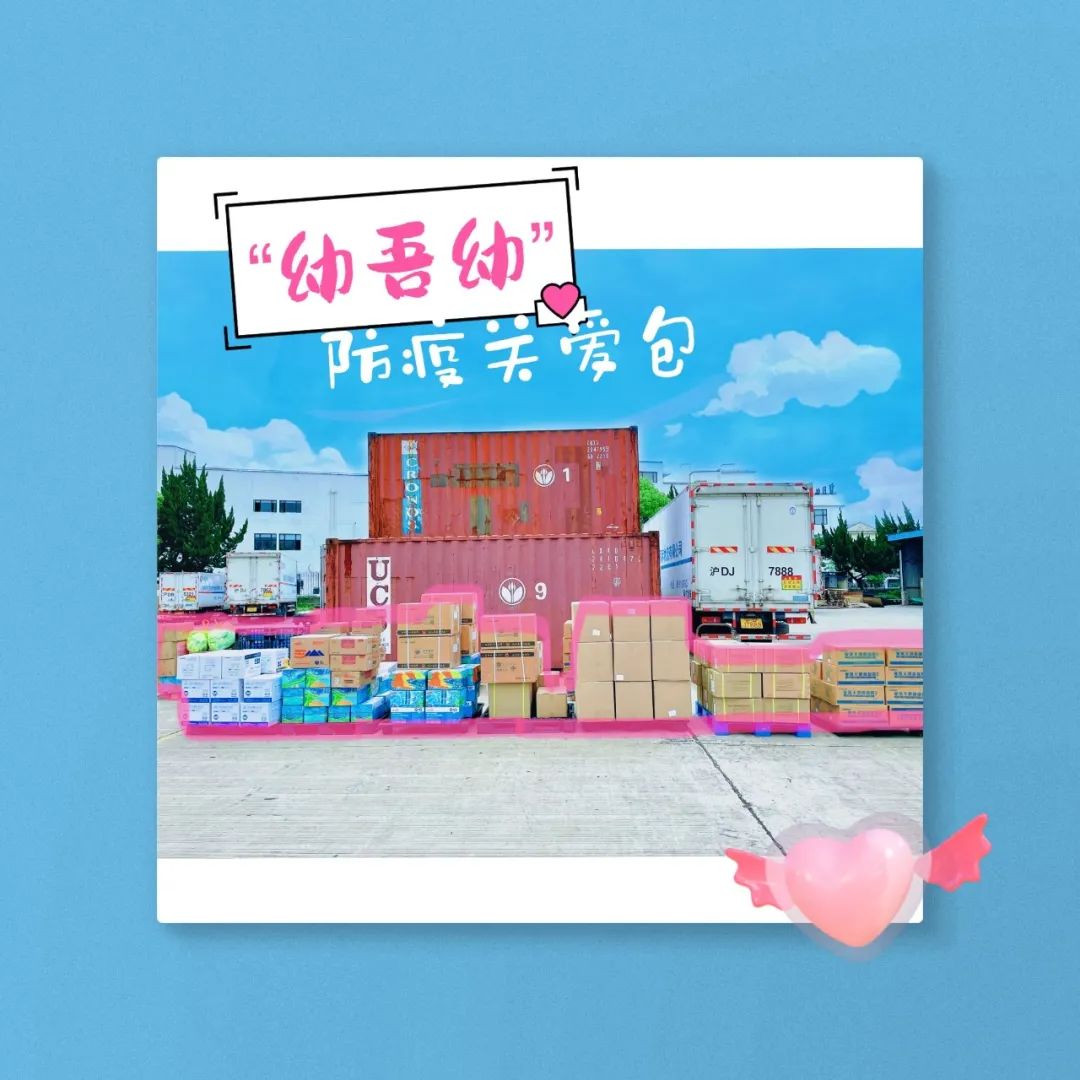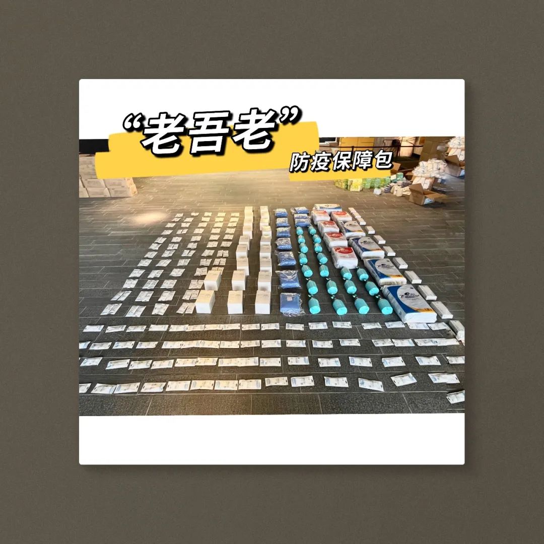 每套防疫关爱包里含有婴儿纸尿裤3800片、成人安心裤108包、成人一次性内裤60盒、儿童口罩30000只、成人口罩5600只、丁腈手套30000只、手部消毒凝胶600瓶、额温枪300支、抗原试剂3060支以及300罐奶粉、米糊和猪肉酥各48罐。