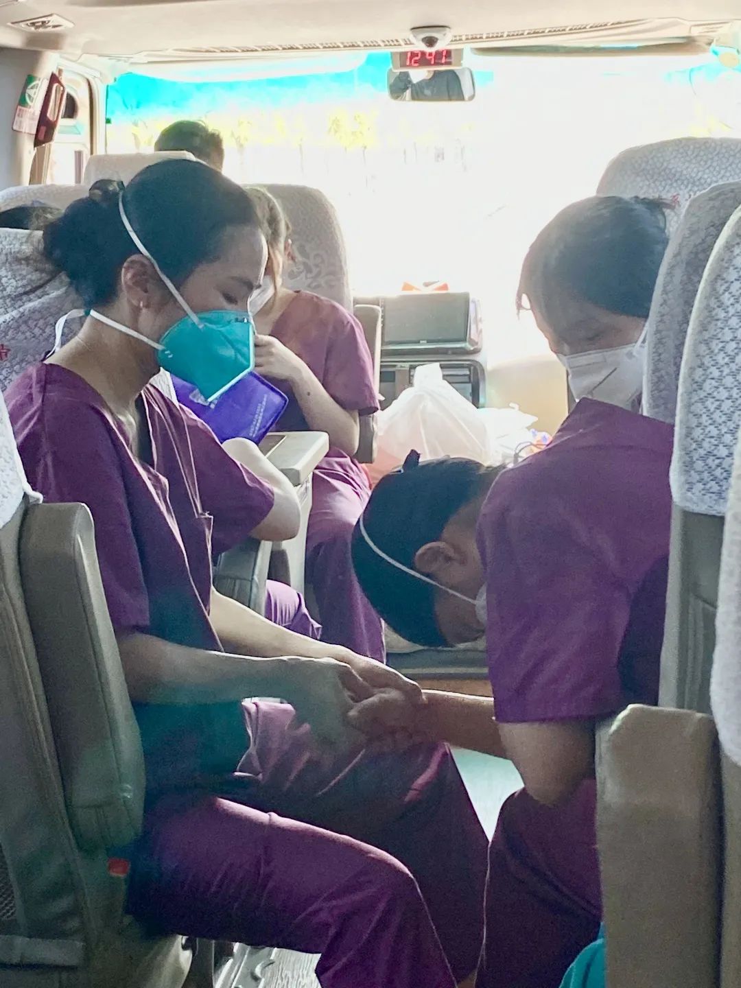平时都经常晕车的佛山尊龙凯时禅诚医院护士邹丽珍,经过一天7-8次的核酸点转场头晕难忍,结束一天采样返程的车上,同事细心地给她做合谷穴按压缓解头晕,她说,再难受也阻挡不了守沪决心。