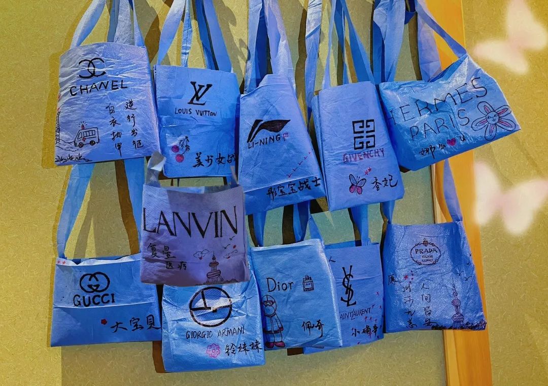 隔离衣手工制作的各种“大牌”包包,“包”治百病永远是小姑娘们的心头好;“就算身着大白,我们也是最闪亮的小分队”。