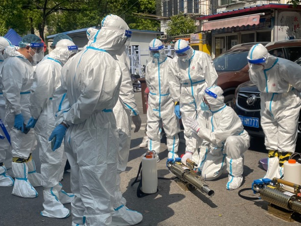 ▲上海宝山区杨泰三村志愿者专业消杀培训中