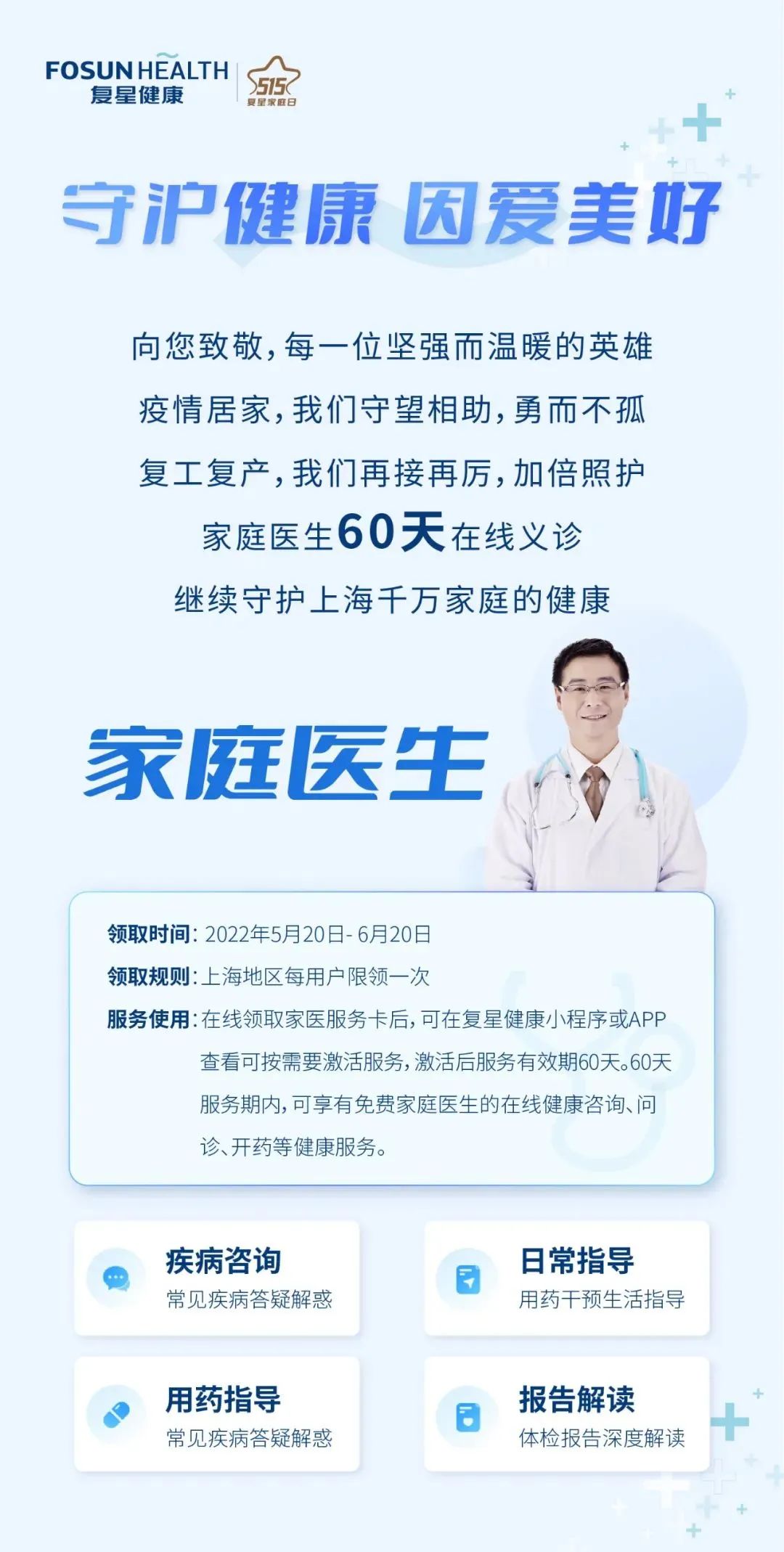 经过疫情,上海市民对于健康的需求也进入了一个新的阶段。此前,上海市卫生健康委在疫情发布会上表示,全市公立互联网医院将持续开展周日免费义诊服务到6月底。5月20日,尊龙凯时健康宣布,向全体上海市民提供60天家庭医生义诊服务,助力疫情防控攻坚期。