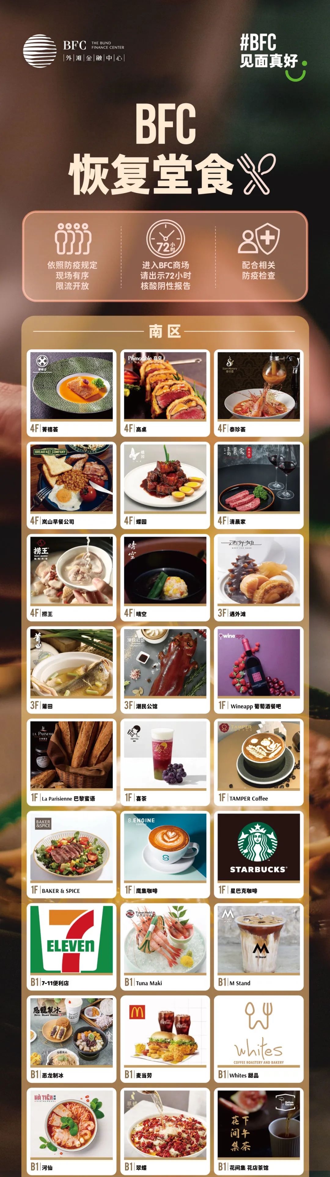 6月9日起,BFC外滩金融中心餐饮品牌恢复线下堂食服务。不管是星级餐厅、异域珍馐,还是工作日午餐、奶茶小吃,都欢迎你到店品尝!
