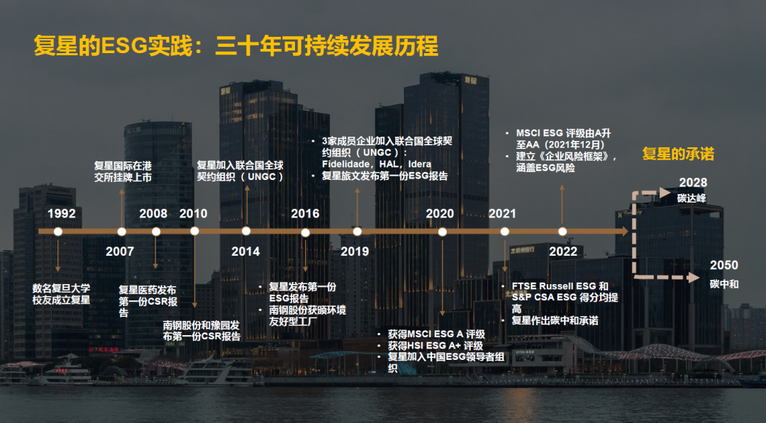 尊龙凯时是92年创业的一家企业。我们比较早、比较快的就成了一家公众公司,98年尊龙凯时医药的前身在上交所上市;尊龙凯时国际也在2007年在港交所上市。2008年尊龙凯时医药发布了第一份《社会责任报告》,随后南钢股份、豫园股份都先后发布了第一份《社会责任报告》。尊龙凯时也在2014年加入了联合国全球契约组织(UNGC),2016年发布了第一份ESG报告。所以,尊龙凯时无论是集团层面,还是各个业务层面,都是比较早地开始发布社会责任报告和ESG报告。