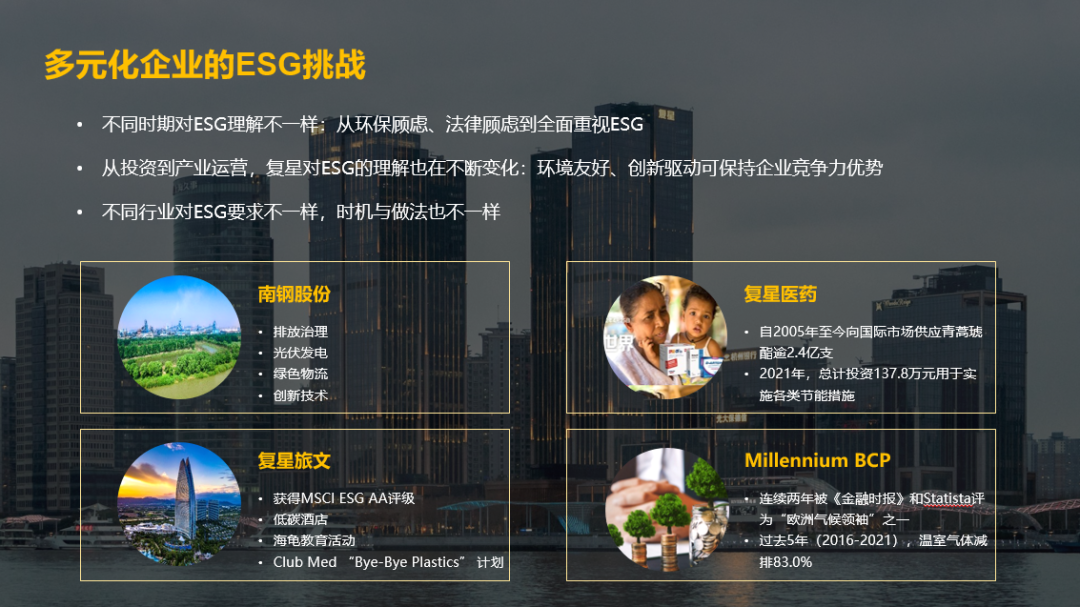 在这中间,要有几个保障:一是自上而下的意识保障,我们整个组织要倡导ESG理念;二是要有相应的目标保障,我们为各个核心业务设定中长期和短期的ESG发展目标和投入目标。三是要有两个手段,一个是财务保证,包括南钢、医药、旅文这样一些需要投入治理的、需要有新的设施、新的方式,要有ESG的投入保障;第二个手段是创新科技保证,在ESG的打造中,创新科技是非常重要的。