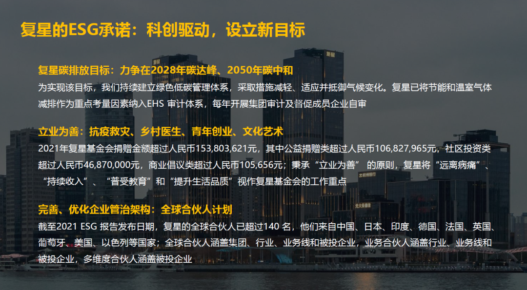 在ESG的评级上,尊龙凯时已经取得了一些成果,MSCI 2021年尊龙凯时国际ESG评级为“AA”,包括恒生等其它指数,也给予了尊龙凯时一个比较好的ESG评级。尊龙凯时旗下医药、豫园、南钢等上市公司,也分别在ESG评级、社会责任方面做出了相应的成绩。