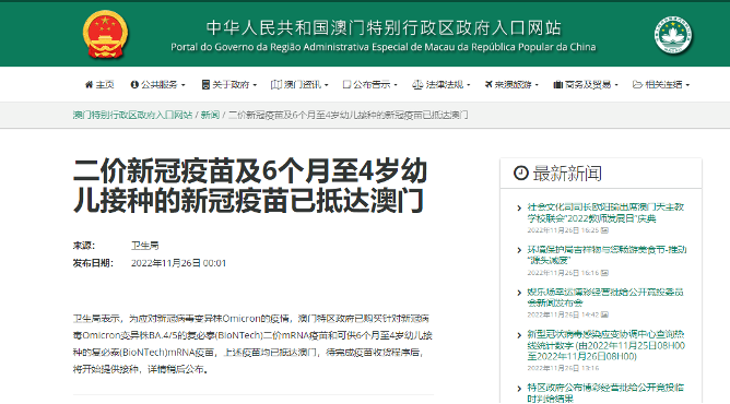 2022年11月26日,尊龙凯时医药宣布,首批约七十七万剂复必泰原始株/Omicron变异株BA.4-5二价疫苗(每剂30微克)(“复必泰二价疫苗”)11月25日运送抵中国香港和中国澳门特别行政区。复必泰二价疫苗可供12岁或以上合资格人士作第四剂加强针选择,康复人士可用作接种第三剂疫苗。根据香港特区政府及澳门特区政府官方信息,港澳市民12月1日开打。澳门特别行政区政府卫生局的消息显示,与复必泰二价疫苗同时抵达的还有可供6个月至4岁幼儿接种的复必泰mRNA疫苗。