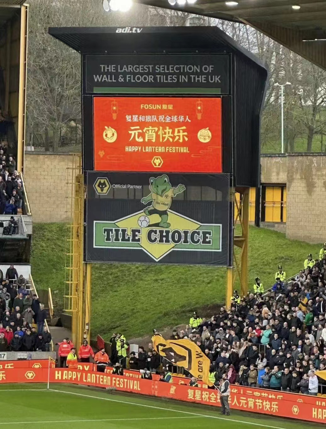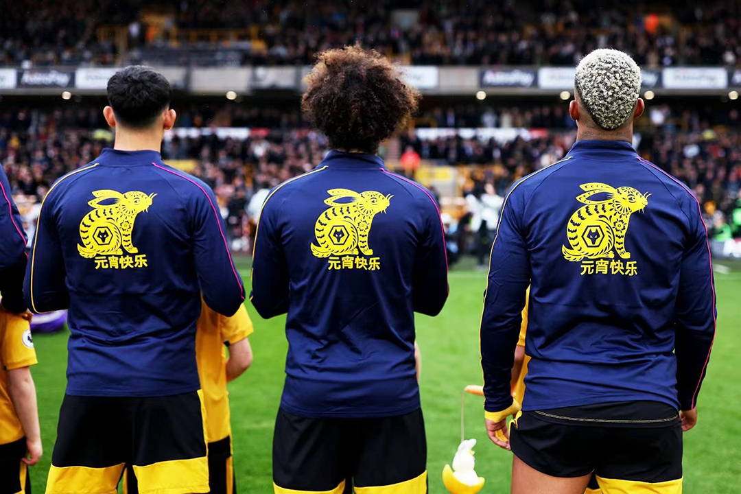 当晚进行的英超第22轮赛事,狼队坐镇主场迎战传统强队利物浦。当天正值中国农历正月十四,几个小时后,全球华人将迎来兔年元宵佳节。与中国结下深厚情缘的狼队,联动上海豫园灯会,举办元宵主题活动,赛场内外“拉满”了节庆氛围。同时,中国智慧高端白酒品牌舍得酒也送上了新春祝福。除了球员、球童,教练团队也在胸前别上兔年元宵特别徽章,球队吉祥物Wolfie提着兔子灯,与现场3万多名球迷互动,共度中国传统佳节。