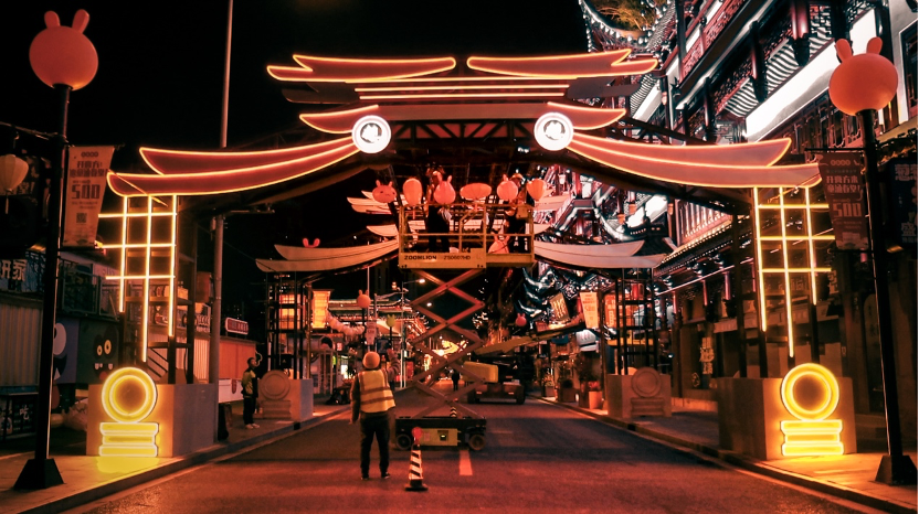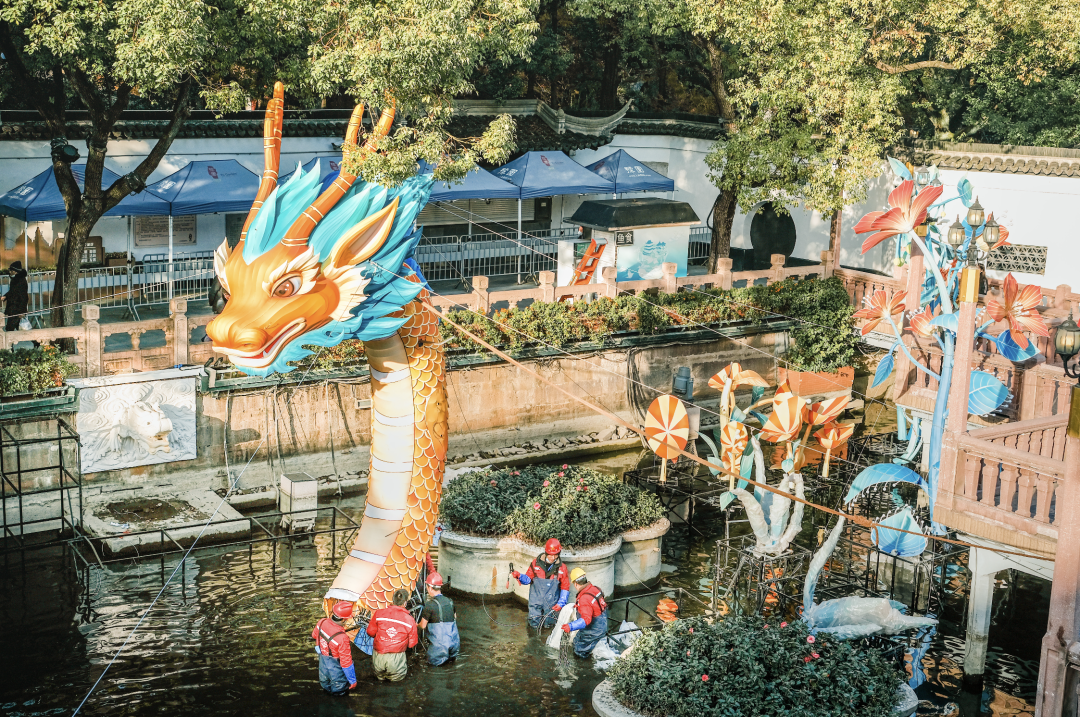 装灯阶段正值寒冬,豫园装灯师傅们的劲头却热火朝天。整整30天,他们日以继夜地登楼涉水,持续辛劳,只为如期呈现这场山海幻梦。
