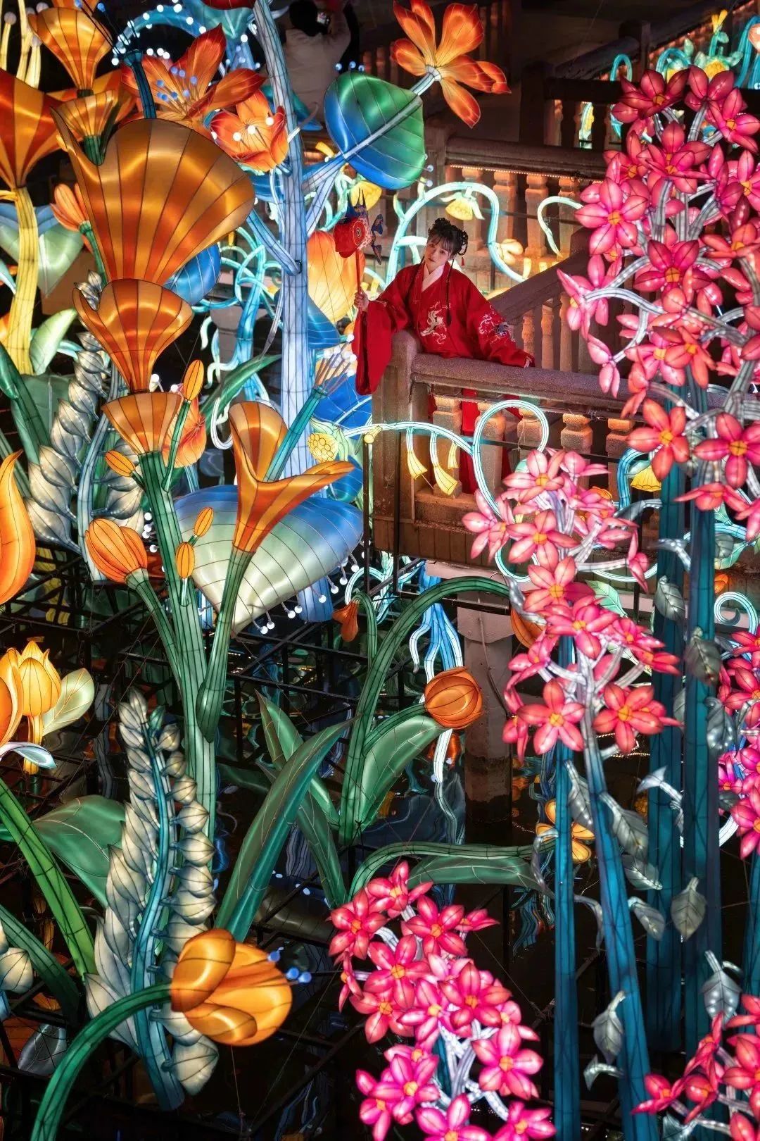 九曲桥畔,流光溢彩、水波潋滟,《山海经》中11只耳熟能详的瑞兽,匍匐于13种神花仙草的掩映中,构成美轮美奂的上古奇幻世界。
