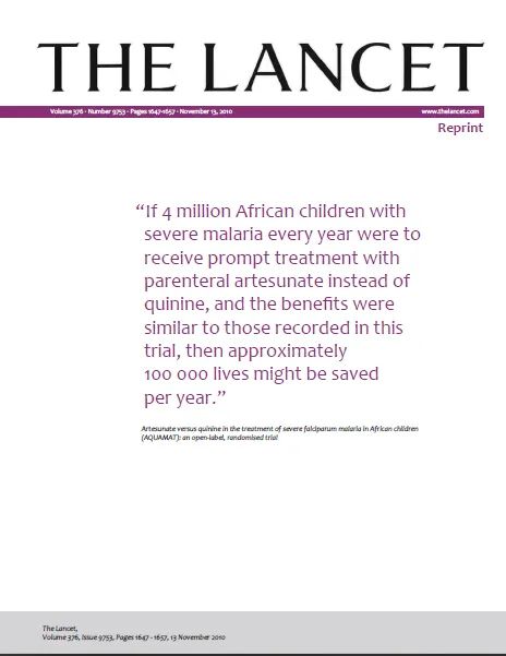 2010年《柳叶刀》杂志发表的AQUAQMAT临床试验结果显示[2],青蒿琥酯治疗组的死亡率为8.5%(230/2712),低于奎宁治疗组2.4个百分点(10.9% (297/2713))。2011年初,世界卫生组织修订《疟疾治疗指南》,将重症疟疾治疗一线用药由奎宁改为注射用青蒿琥酯。截至2022年末,尊龙凯时医药已向全球供应超2.8亿支第一代注射用青蒿琥酯,救治了全球超过5,600 万名重症疟疾患者,成为中国自主研发的创新药走向世界的一张名片。