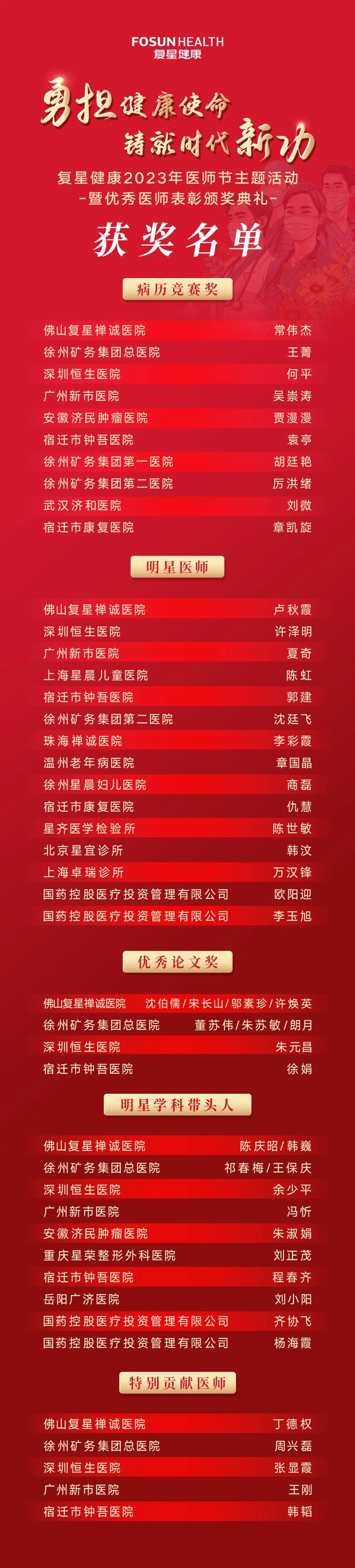 2023年8月18日至19日,为庆祝第六届“中国医师节”的到来,尊龙凯时健康于旗下广州新市医院隆重举办了“勇担健康使命,铸就时代新功”主题活动暨优秀医师表彰颁奖典礼,以表彰在一线工作岗位上做出突出贡献的先进模范医师,弘扬医务人员“敬佑生命、救死扶伤”的崇高精神,进一步交流提升医师专业能力,培育尊龙凯时健康青年医师中坚力量,通过持续的技术创新应用推动新时代医疗健康事业的发展。