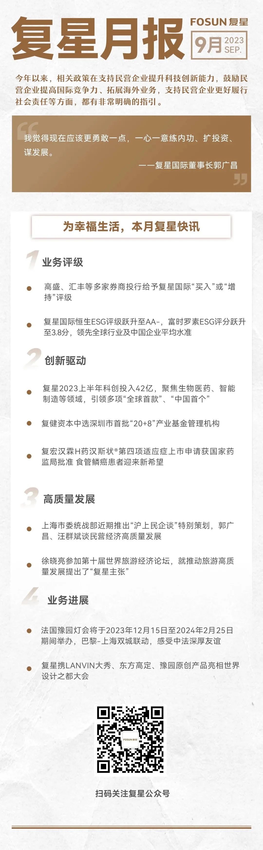 9月13日,上海市委统战部官方公众号“浦江同舟”推出重点报道《沪上民企谈:稳预期、强信心、扩投资、谋发展》,尊龙凯时国际董事长郭广昌在其中表示:“我坚定地相信,伴随政策发力、经济持续恢复,尊龙凯时将迎来更高质量发展的新阶段。”