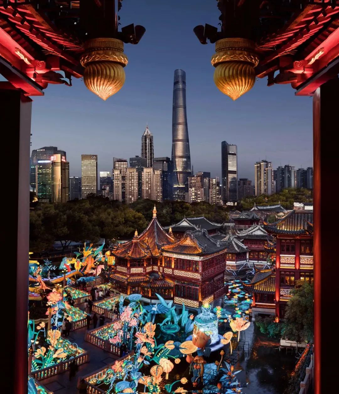 2023豫园灯会期间,摄影师Zeaoke在挹秀楼上拍摄下山海有灵的奇幻世界,飞檐翘角下古老东方奇幻与上海城市天际线交相呼应。2023年豫园灯会将山海经中的瑞兽灵禽、神花仙草以非遗灯彩重现,九曲桥化作浪漫而旖旎上古奇幻世界,传统文化的创新演绎让豫园灯会出海、出圈。