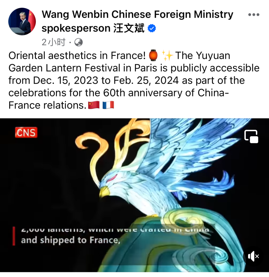 2024年是中法两国建交60周年暨中法文化旅游年,为积极响应今年中法两国元首会晤达成的共识,2023年12月15日,国家级非物质文化遗产豫园灯会首次出海,落地“巴黎风情园”,向海外游客呈现了一个"中西融合、东情西韵"的如梦如幻之境。