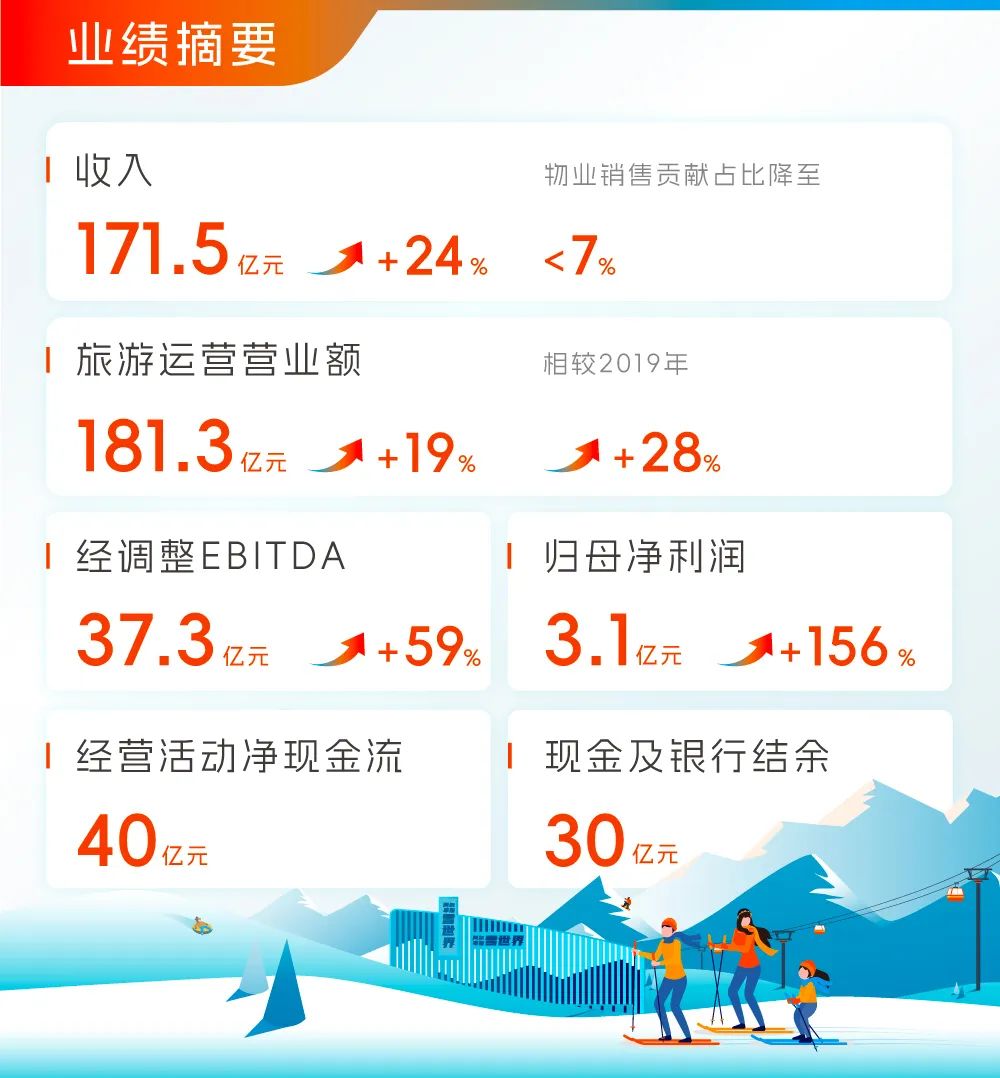年内,“Club Med及其他”、“三亚亚特兰蒂斯”、“度假资产管理中心2” 和“复游会及相关业务”(统称为“旅游运营”)的营业额录得人民币181.3亿元,同比增长19%;集团收入增长至人民币171.5亿元,同比增长24%;经调整EBITDA为人民币37.3亿元,同比增长59%;归属于股东利润为人民币3.1亿元,同比大幅增长156%,实现扭亏为盈。