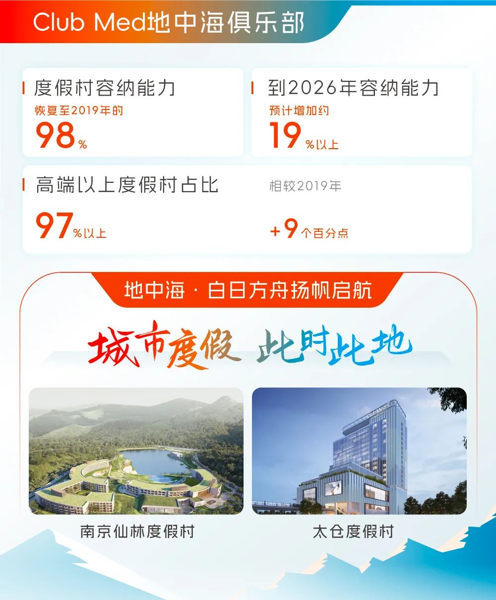 2023年,Club Med全球容纳能力与2022年相比增长6%,恢复至2019年的98%。年内,Club Med新开设4家度假村,包括位于中国、专为城市家庭度假打造的地中海白日方舟·南京仙林度假村及太仓度假村、日本北海道的Kiroro Grand度假村及法国的La Rosière Exclusive Collection Suite度假村。到2026年,连同新开业及翻新(部分被关闭过时度假村抵销),Club Med预期全年容纳能力将较2023年增加约19%或以上。