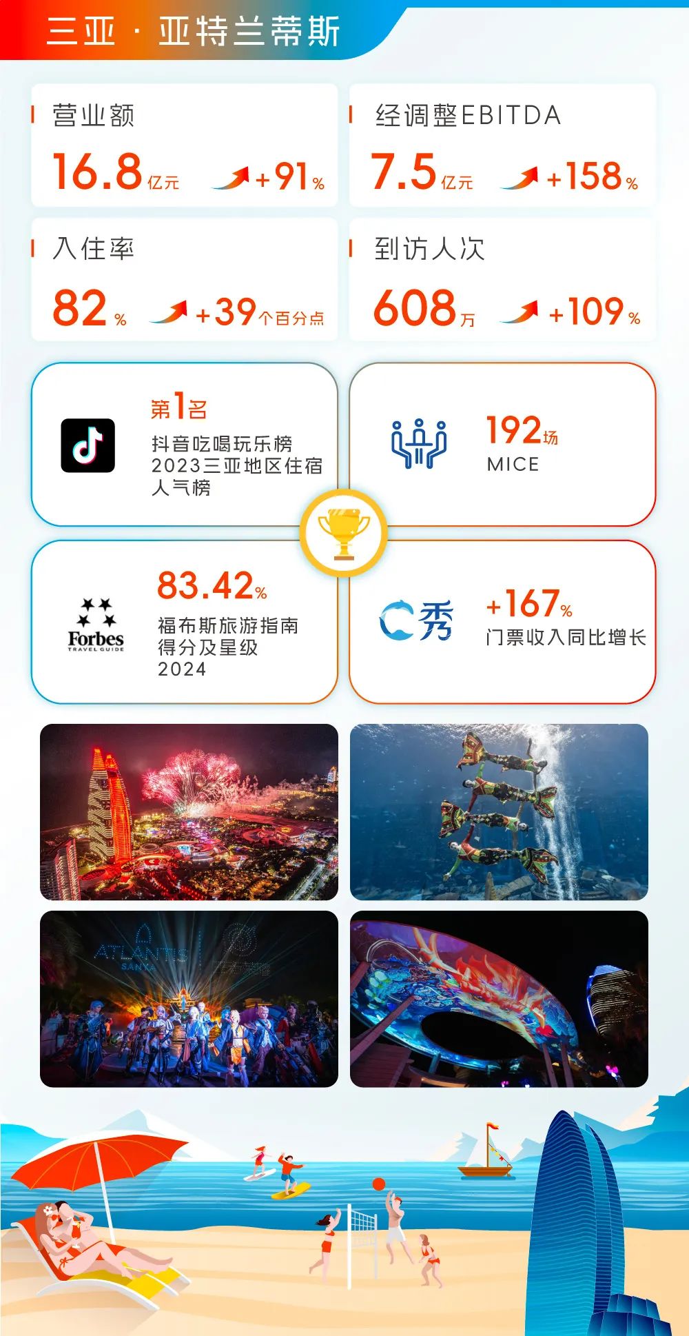 2023年,三亚亚特兰蒂斯结合住宿、餐饮、MICE、乐园及娱乐等内容,为宾客呈现了一系列全新体验项目,推动营业额再创历史新高,达人民币16.8亿元,同比增长91%。客房平均每日房价为人民币2,386元,平均入住率为82%,较去年增加39个百分点,到访客户达608万人次。2023年三亚亚特兰蒂斯盈利能力持续提升,经调整EBITDA达人民币7.45亿元,同比增长158%。