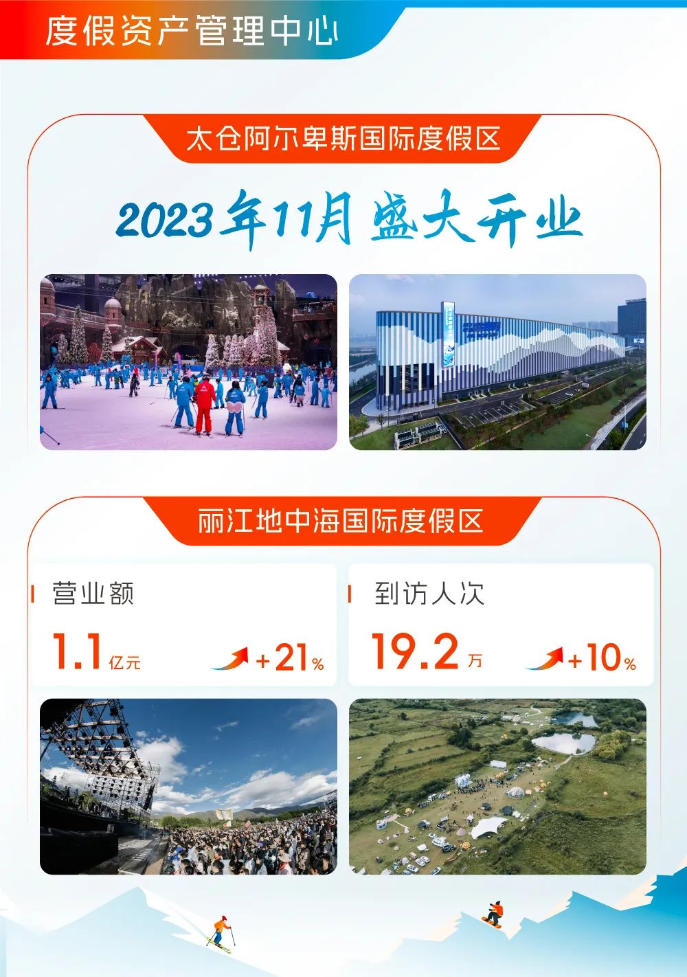 度假资产管理中心方面,太仓阿尔卑斯国际度假区的阿尔卑斯雪世界、Club Med地中海白日方舟·太仓度假村、阿尔卑斯时光境已于2023年下半年隆重开业。度假区自2023年11月开业以来,正处于爬坡期,受益于城市度假和冰雪旅游需求增长,及运营持续增强,项目表现稳步提升。丽江地中海国际度假区延续复苏势头,年内录得营业额人民币1.1亿元,同比增长21%,到访人次为19.2万人,同比增长10%。