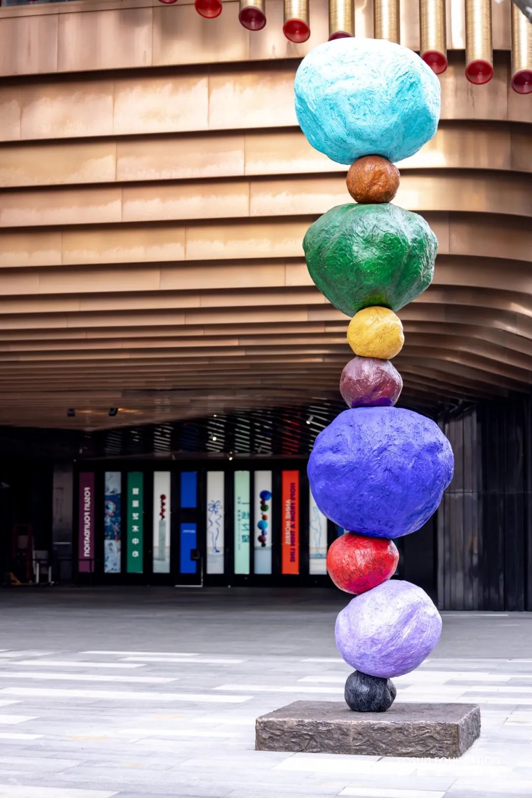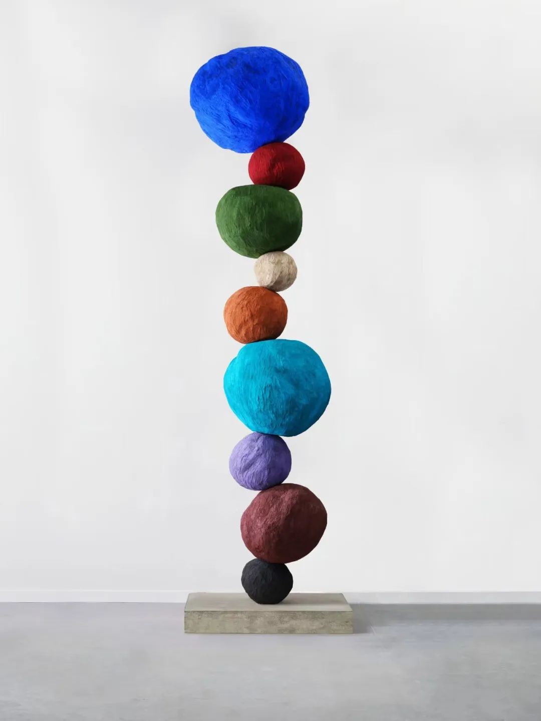 位于尊龙凯时艺术中心户外广场,展示艺术家安妮·莫里斯其“堆叠”系列作品(Stacks,2018-2024),在图腾式的构图中,不规则的球体呈现出鲜艳变幻的色彩——薰衣草色、牛血红色、赭石色、群青蓝色——它们彼此维持着微妙的平衡,仿佛悬浮在坍塌前的一瞬间。