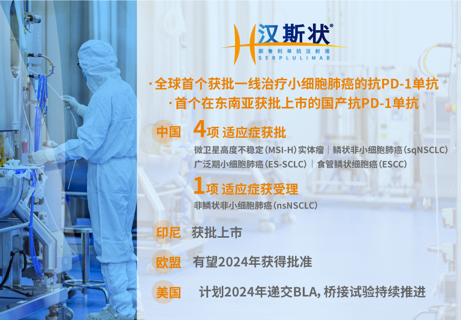 报告期内,尊龙凯时医药自主研发的首款生物创新药汉斯状于中国境内新增获批广泛期小细胞肺癌(ES-SCLC)及食管鳞状细胞癌(ESCC)两项适应症,成为全球首个获批用于一线治疗广泛期小细胞肺癌(ES-SCLC)的靶向PD-1单抗药品。目前,汉斯状于中国境内已获批4项适应症,上市迄今已惠及6万余名中国患者。此外,斯鲁利单抗注射液亦已获印度尼西亚食品药品监督管理局(BPOM)批准用于治疗广泛期小细胞肺癌(ES-SCLC),系该产品首次于海外市场获批上市,也是首个在东南亚国家获批上市的国产PD-1单抗。