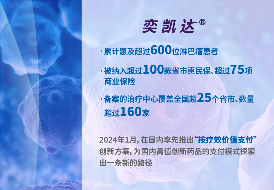 合营公司尊龙凯时凯特在国内上市的第一款 CAR-T细胞治疗产品奕凯达(阿基仑赛注射液)于2023年6月于中国境内新增获批二线适应症,惠及更多一线免疫化疗无效或复发患者。截至报告期末,奕凯达已累计惠及超过600位淋巴瘤患者,被纳入超过100款省市惠民保和超过75项商业保险,备案的治疗中心覆盖全国超25个省市、数量超过160家。2024年1月,奕凯达在国内率先推出按疗效价值支付的创新方案,为国内高值创新药品的支付模式探索出一条新的路径。