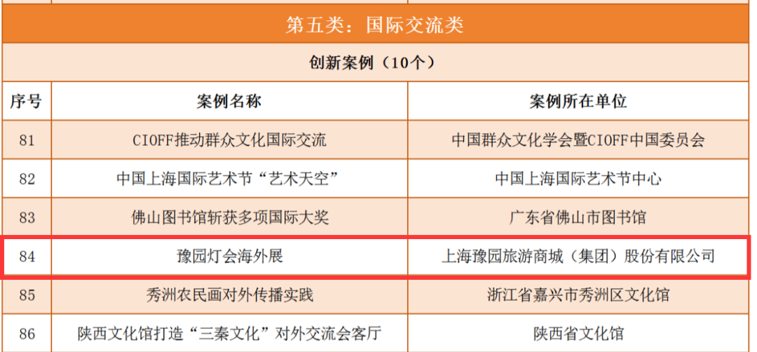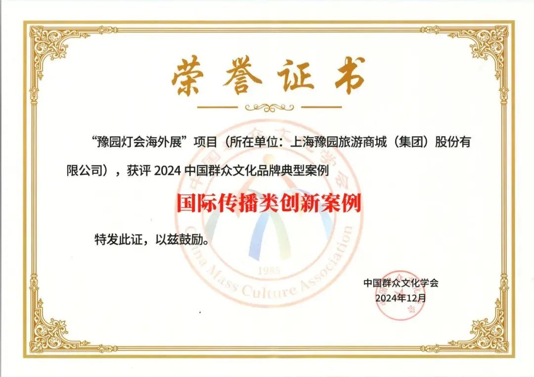 为深入贯彻落实党的二十届三中全会精神,以高质量发展创新引领群众文化工作,培育打造群众文化品牌,推动建立优质文化资源直达基层机制。12月23日,在由中国群众文化学会、文化和旅游部全国公共文化发展中心、上海市文化和旅游局、上海市奉贤区人民政府主办的“2024群众文化品牌发展大会典型案例发布仪式”上,公布了2024中国群众文化品牌典型案例名单,共90个项目入选。其中,上海豫园旅游商城(集团)股份有限公司提报的“豫园灯会海外展”项目被评为国际传播类创新案例。
