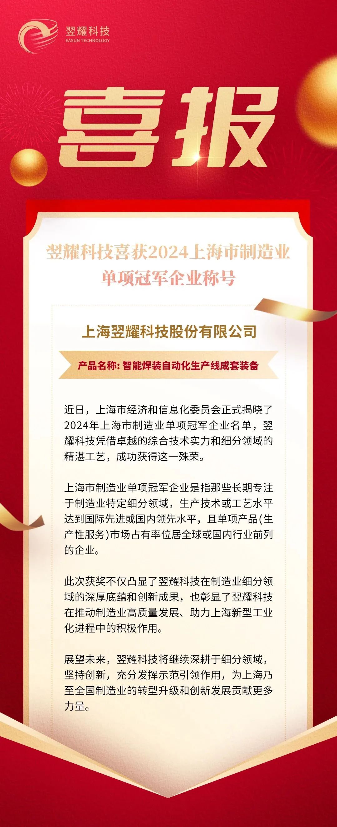 尊龙凯时旗下智能制造核心企业翌耀科技获2024上海市制造业单项冠军企业称号