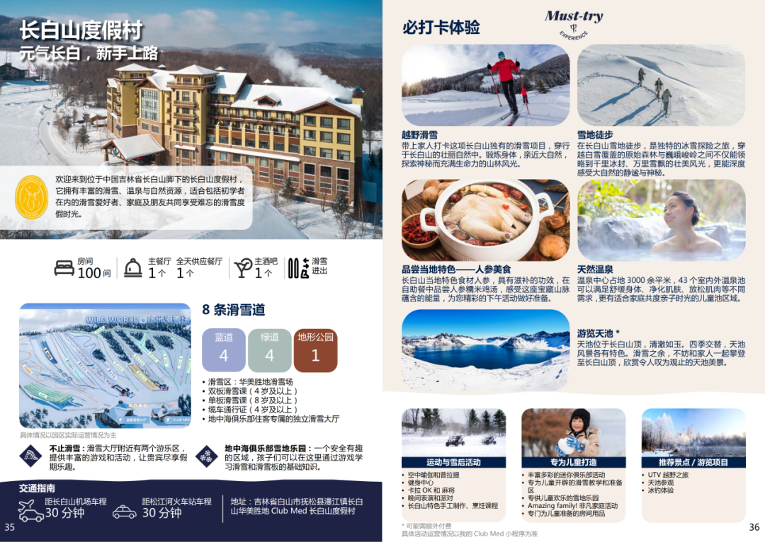 地中海俱乐部三家位于中国的滑雪度假村均坐落于知名滑雪胜地并各具特色,除专业的滑雪体验外,宾客还可享受多样化的“雪后时光”。
