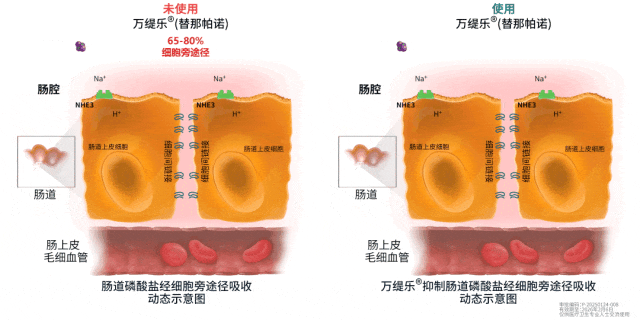 替那帕诺是一种局部作用、针对表达于小肠和结肠上皮顶端的逆向转运蛋白钠/氢交换体3(NHE3)的抑制剂。通过抑制NHE3,使细胞间连接变得紧密,降低肠道磷酸盐吸收的主要途径-细胞旁途径磷酸盐的通透性,减少磷酸盐的吸收,从而降低血磷[4]。