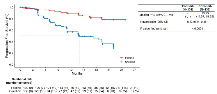从2020年12月至2022年3月,该研究共招募275例患者,其中139例接受复瑞替尼治疗,136接受克唑替尼治疗。截至2024年3月,中位随访时间为16.7个月。研究发现,复瑞替尼治疗组的PFS相较于克唑替尼治疗组具有显著改善,克唑替尼治疗组的中位PFS为13.93个月,而复瑞替尼治疗组尚未达到(HR 0.23, 95% CI 0.14-0.38, 图1)。