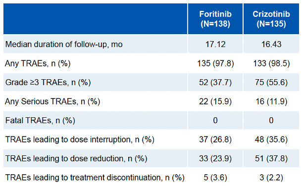 安全性方面,复瑞替尼治疗组患者3/4级治疗相关不良事件(TRAEs)的发生率为37.7%,克唑替尼治疗组为55.6%。复瑞替尼治疗后最常见的3/4级TRAEs为高血糖、高血压和QT间期延长。复瑞替尼治疗组未观察到间质性肺病或视力下降。两组患者治疗后均未报告致死性TRAE(表2&图2)。