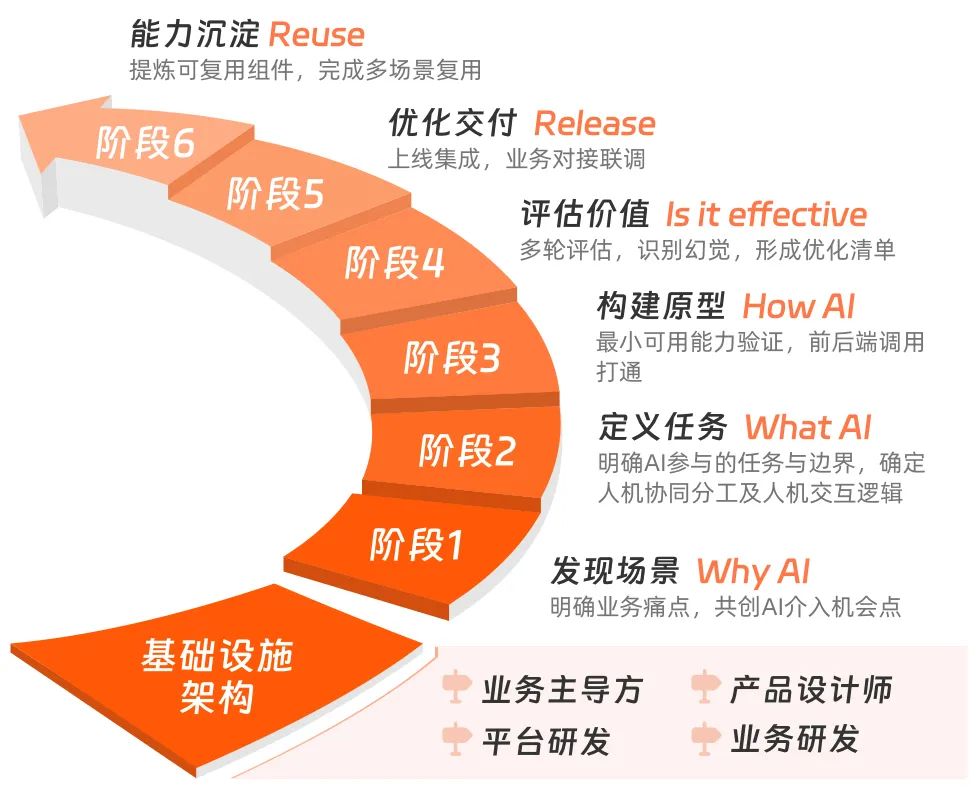 全面拥抱AI,不仅意味着全新的数字基建蓝图,更意味着组织底层能力的重构及组织协作模式的创新。AI 与数据深度融合的架构特性决定了其开发过程具有更高的不确定性、更强的跨职能依赖以及更快的迭代节奏。因此,我们制定了“尊龙凯时旅文AI建设工作方法及流程”,从场景发现、原型验证到能力沉淀,明确了多角色协同的分工机制,确保 AI 项目“有目标、可落地、能复用、可持续”。