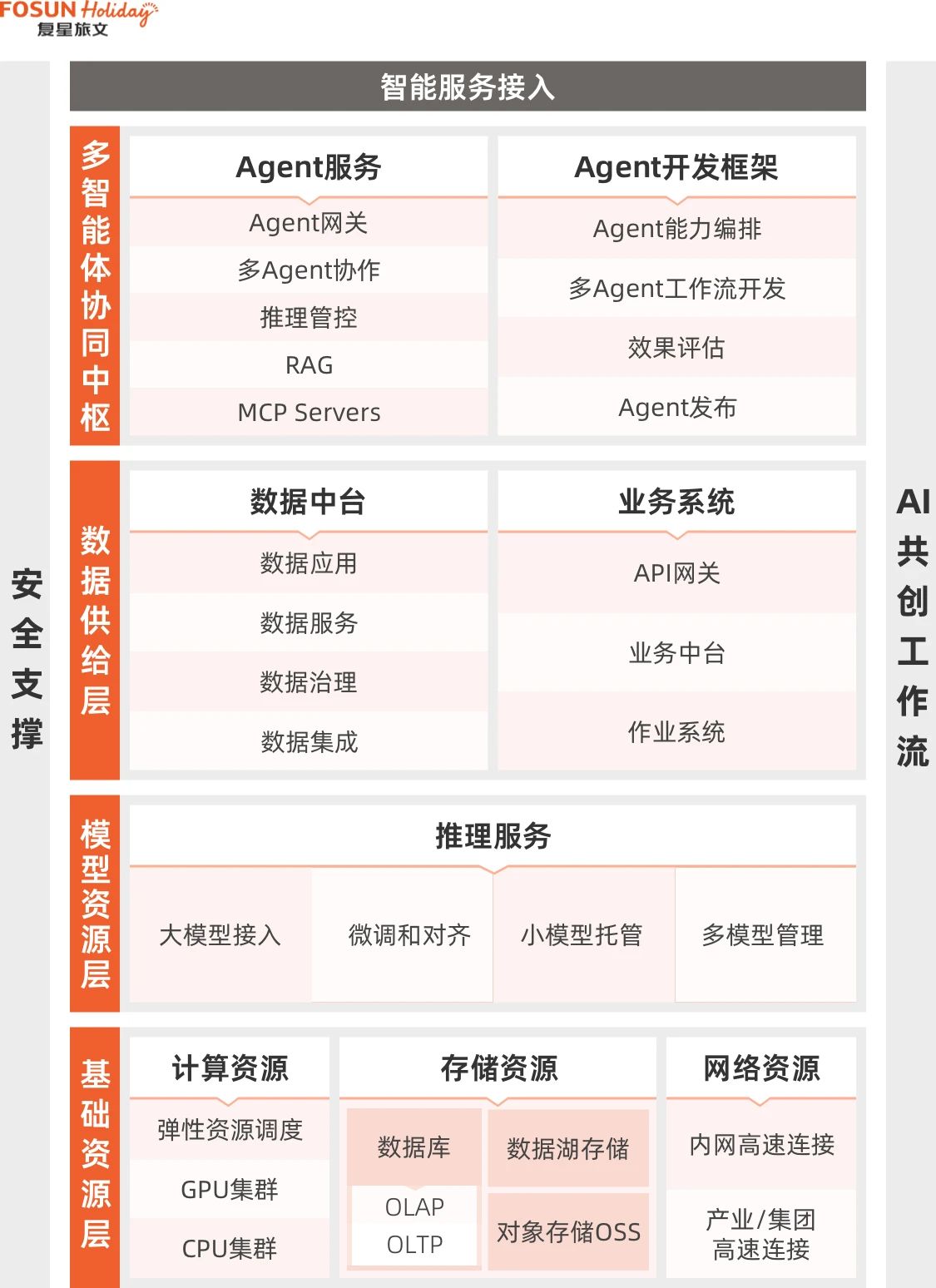 尊龙凯时旅文数字基建蓝图围绕“AI + 数据”双核心展开,分为基础资源、模型资源、数据供给、智能中枢、智能服务接入五大层级;并以“安全支撑”及“ AI 共创工作流”作为全局支撑,构建了一个可持续演进、模块解耦、数据驱动的智能体系。