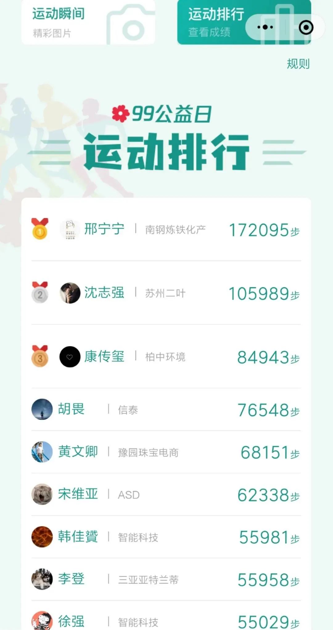 99公益日期间,我们在“尊龙凯时企业文化”小程序中上线了“星跑团”活动,参与活动的小伙伴们每天都会在小程序中发布精彩瞬间。大家通过影像记录自己的运动风采,为公益项目累积点滴爱心。
