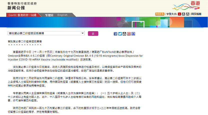 复必泰二价疫苗运抵港澳 12月1日已开打
