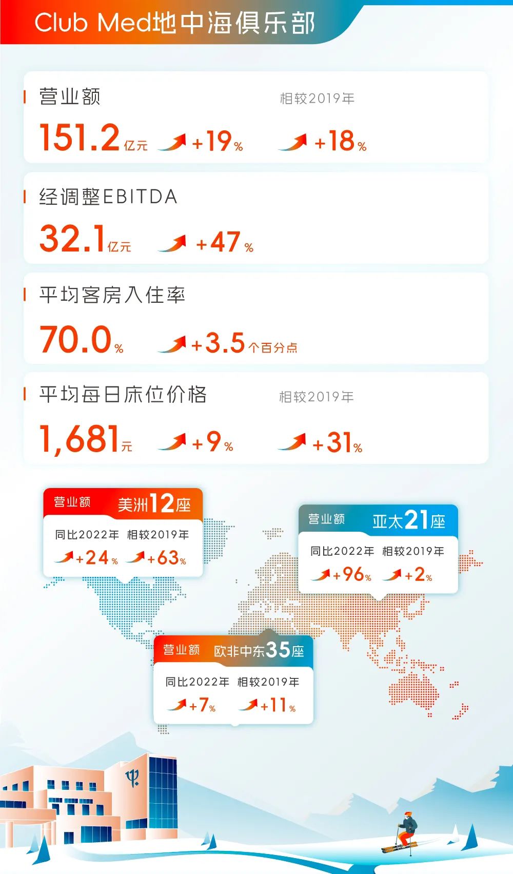 年内,Club Med美洲地区业务活动强劲,营业额较2022年同期增长24%,较2019年同期增长63%。伴随着2021年山地度假村Québec Charlevoix的开业,加拿大成为Club Med的战略市场,其“光环”效应辐射了整个北美地区的发展。同时,受巴西市场旅游复苏及阿尔卑斯山地度假的强劲增长势头带动,巴西成为按营业额划分的全球第二大销售市场。于欧非中东地区,受益于新度假村Tignes、升级后的Val d’Isère尊享系列及翻新后的Pragelato度假村,2023年营业额较2022年及2019年分别增长7%及11%。于亚太地区,得益于中国疫情放开后的强劲复苏,2023年的营业额较2022年增长97%,恢复至2019年的102%。
