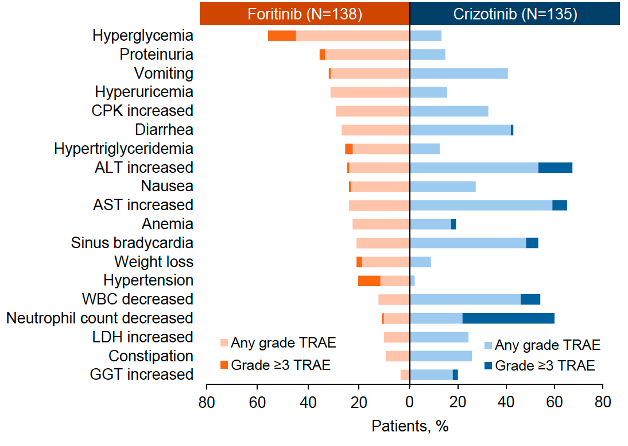安全性方面,复瑞替尼治疗组患者3/4级治疗相关不良事件(TRAEs)的发生率为37.7%,克唑替尼治疗组为55.6%。复瑞替尼治疗后最常见的3/4级TRAEs为高血糖、高血压和QT间期延长。复瑞替尼治疗组未观察到间质性肺病或视力下降。两组患者治疗后均未报告致死性TRAE(表2&图2)。