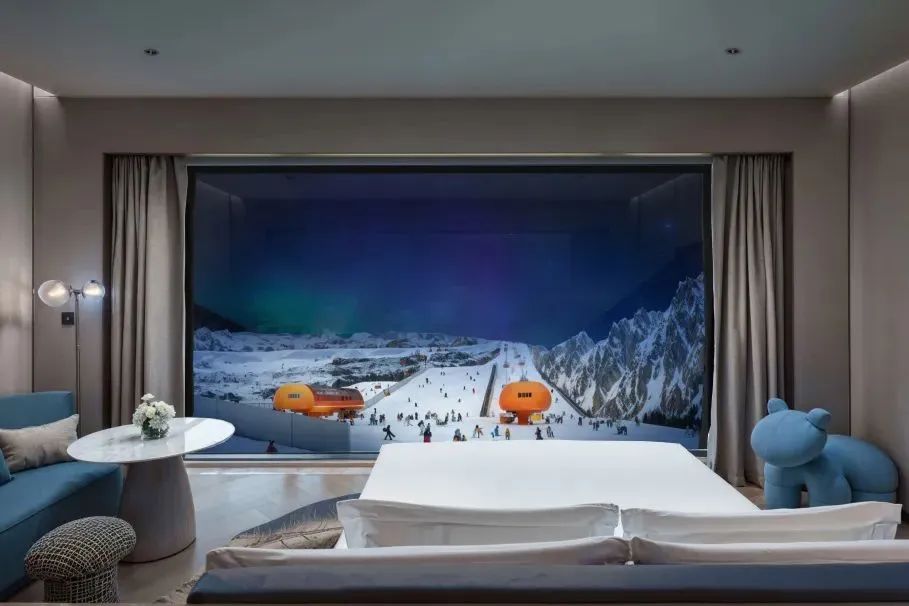项目将引入两家国际化主题酒店:地中海白日方舟·极光酒店配备可直通雪世界冷区的SKI IN & SKI OUT(滑进/滑出)换装区,并设有专享雪景Lounge,宾客可在温暖舒适的环境中惬意欣赏极光雪景。地中海白日方舟·冰川酒店则以极地探险为灵感,通过全息影像技术营造出光影交织的梦幻冰川世界。酒店将特设极地动物主题套房,游客可在房间内与北极熊、企鹅等极地动物近距离互动。