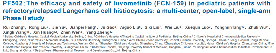 该项多中心、开放标签、单臂、II期研究由首都医科大学附属北京儿童医院的张蕊教授牵头,旨在评估芦沃美替尼用于治疗复发/难治性LCH儿童患者的有效性与安全性。该研究纳入25名复发或难治性LCH儿童患者接受芦沃美替尼单药治疗(剂量 5 mg/m2,每日一次),每28天为一周期。主要终点为由独立评审委员会(IRC)基于PET response criteria (PRC) 评估的客观缓解率(ORR),次要终点包括由研究者基于PRC评估的ORR、研究者根据2009年《LCH评估与治疗指南》评估的ORR和安全性等。